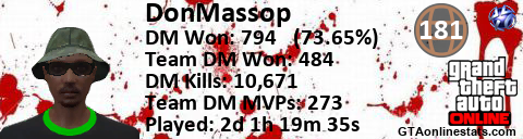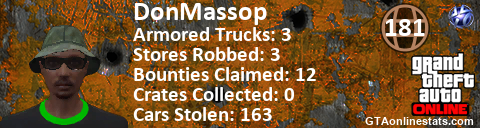 [URL=http://GTAonlinestats.com/showplayer/DonMassop][IMG]http://GTAonlinestats.com/randomsignature/DonMassop/sig.png[/IMG][/URL]