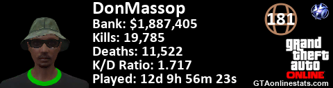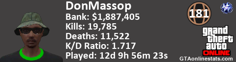 <a href="http://GTAonlinestats.com/showplayer/DonMassop"><img src="http://GTAonlinestats.com/signature/DonMassop/sig.png" alt="DonMassop" border="0" /></a>