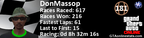 [URL=http://GTAonlinestats.com/showplayer/DonMassop][IMG]http://GTAonlinestats.com/racesignature/DonMassop/sig.png[/IMG][/URL]