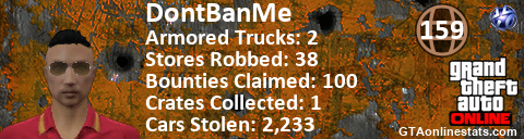 [URL=http://GTAonlinestats.com/showplayer/DontBanMe][IMG]http://GTAonlinestats.com/crimesignature/DontBanMe/sig.png[/IMG][/URL]