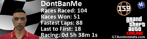[URL=http://GTAonlinestats.com/showplayer/DontBanMe][IMG]http://GTAonlinestats.com/racesignature/DontBanMe/sig.png[/IMG][/URL]