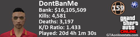 [URL=http://GTAonlinestats.com/showplayer/DontBanMe][IMG]http://GTAonlinestats.com/randomsignature/DontBanMe/sig.png[/IMG][/URL]