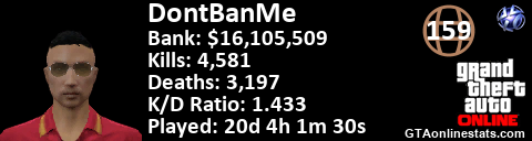 [URL=http://GTAonlinestats.com/showplayer/DontBanMe][IMG]http://GTAonlinestats.com/signature/DontBanMe/sig.png[/IMG][/URL]