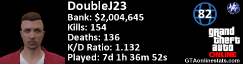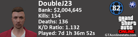 <a href="http://GTAonlinestats.com/showplayer/DoubleJ23"><img src="http://GTAonlinestats.com/signature/DoubleJ23/sig.png" alt="DoubleJ23" border="0" /></a>
