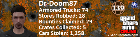 [URL=http://GTAonlinestats.com/showplayer/Dr-Doom87][IMG]http://GTAonlinestats.com/greysignature/Dr-Doom87/sig.png[/IMG][/URL]