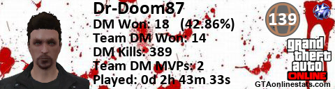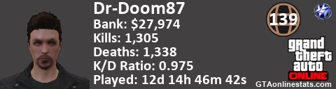 [URL=http://GTAonlinestats.com/showplayer/Dr-Doom87][IMG]http://GTAonlinestats.com/dmsignature/Dr-Doom87/sig.png[/IMG][/URL]
