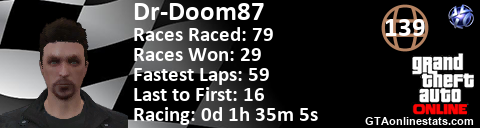 <a href="http://GTAonlinestats.com/showplayer/Dr-Doom87"><img src="http://GTAonlinestats.com/racesignature/Dr-Doom87/sig.png" alt="Dr-Doom87" border="0" /></a>