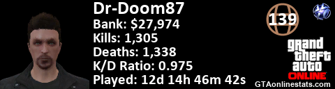<a href="http://GTAonlinestats.com/showplayer/Dr-Doom87"><img src="http://GTAonlinestats.com/signature/Dr-Doom87/sig.png" alt="Dr-Doom87" border="0" /></a>