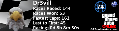 <a href="http://GTAonlinestats.com/showplayer/Dr3vill"><img src="http://GTAonlinestats.com/racesignature/Dr3vill/sig.png" alt="Dr3vill" border="0" /></a>