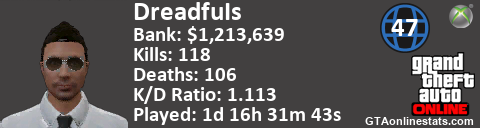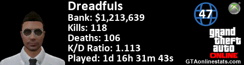 [URL=http://GTAonlinestats.com/showplayer/DreadfuIs][IMG]http://GTAonlinestats.com/signature/DreadfuIs/sig.png[/IMG][/URL]