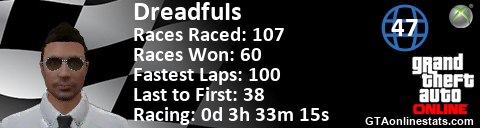 [URL=http://GTAonlinestats.com/showplayer/DreadfuIs][IMG]http://GTAonlinestats.com/racesignature/DreadfuIs/sig.png[/IMG][/URL]