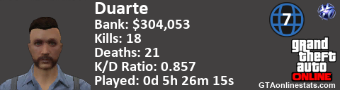 <a href="http://GTAonlinestats.com/showplayer/Duarte"><img src="http://GTAonlinestats.com/randomsignature/Duarte/sig.png" alt="Duarte" border="0" /></a>