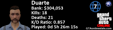 [URL=http://GTAonlinestats.com/showplayer/Duarte][IMG]http://GTAonlinestats.com/greysignature/Duarte/sig.png[/IMG][/URL]