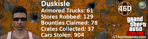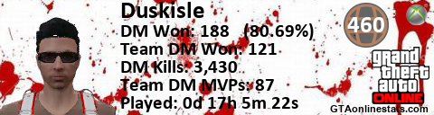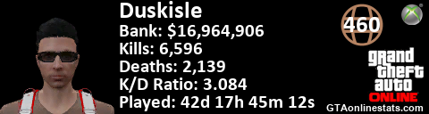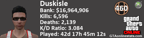 <a href="http://GTAonlinestats.com/showplayer/Duskisle"><img src="http://GTAonlinestats.com/greysignature/Duskisle/sig.png" alt="Duskisle" border="0" /></a>