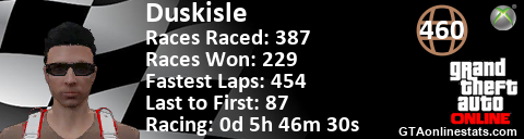 <a href="http://GTAonlinestats.com/showplayer/Duskisle"><img src="http://GTAonlinestats.com/racesignature/Duskisle/sig.png" alt="Duskisle" border="0" /></a>
