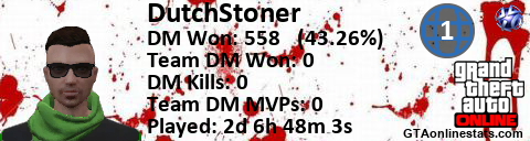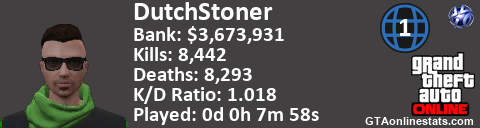[URL=http://GTAonlinestats.com/showplayer/DutchStoner/2][IMG]http://GTAonlinestats.com/signature/DutchStoner/2/sig.png[/IMG][/URL]