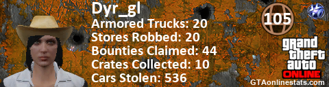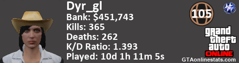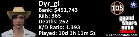 [URL=http://GTAonlinestats.com/showplayer/Dyr_gl/2][IMG]http://GTAonlinestats.com/signature/Dyr_gl/2/sig.png[/IMG][/URL]