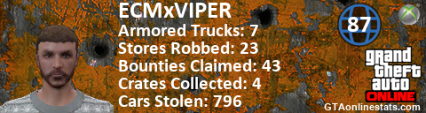 [URL=http://GTAonlinestats.com/showplayer/ECMxVIPER][IMG]http://GTAonlinestats.com/crimesignature/ECMxVIPER/sig.png[/IMG][/URL]