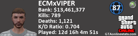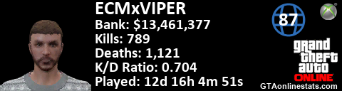 [URL=http://GTAonlinestats.com/showplayer/ECMxVIPER][IMG]http://GTAonlinestats.com/greysignature/ECMxVIPER/sig.png[/IMG][/URL]