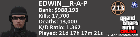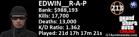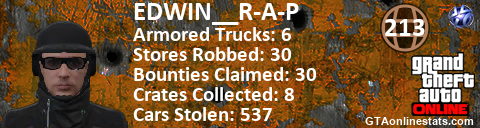 <a href="http://GTAonlinestats.com/showplayer/EDWIN__R-A-P"><img src="http://GTAonlinestats.com/signature/EDWIN__R-A-P/sig.png" alt="EDWIN__R-A-P" border="0" /></a>