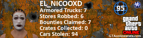 [URL=http://GTAonlinestats.com/showplayer/EL_NICOOXD][IMG]http://GTAonlinestats.com/crimesignature/EL_NICOOXD/sig.png[/IMG][/URL]