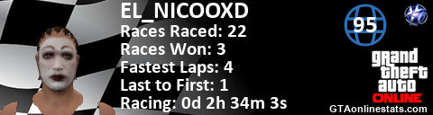 <a href="http://GTAonlinestats.com/showplayer/EL_NICOOXD"><img src="http://GTAonlinestats.com/racesignature/EL_NICOOXD/sig.png" alt="EL_NICOOXD" border="0" /></a>