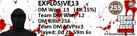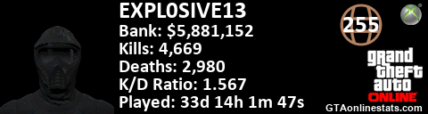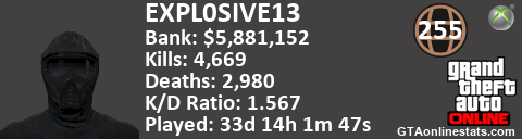 <a href="http://GTAonlinestats.com/showplayer/EXPL0SIVE13"><img src="http://GTAonlinestats.com/signature/EXPL0SIVE13/sig.png" alt="EXPL0SIVE13" border="0" /></a>