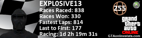 <a href="http://GTAonlinestats.com/showplayer/EXPL0SIVE13"><img src="http://GTAonlinestats.com/racesignature/EXPL0SIVE13/sig.png" alt="EXPL0SIVE13" border="0" /></a>