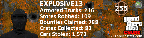 [URL=http://GTAonlinestats.com/showplayer/EXPL0SIVE13][IMG]http://GTAonlinestats.com/signature/EXPL0SIVE13/sig.png[/IMG][/URL]