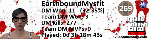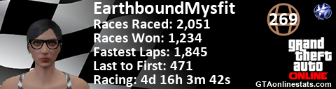 <a href="http://GTAonlinestats.com/showplayer/EarthboundMysfit"><img src="http://GTAonlinestats.com/racesignature/EarthboundMysfit/sig.png" alt="EarthboundMysfit" border="0" /></a>