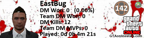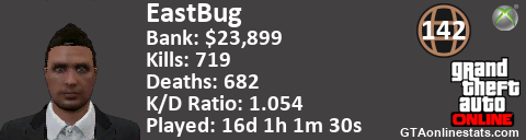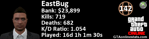 [URL=http://GTAonlinestats.com/showplayer/EastBug][IMG]http://GTAonlinestats.com/dmsignature/EastBug/sig.png[/IMG][/URL]