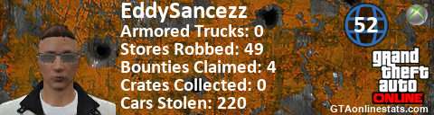 [URL=http://GTAonlinestats.com/showplayer/EddySancezz][IMG]http://GTAonlinestats.com/randomsignature/EddySancezz/sig.png[/IMG][/URL]