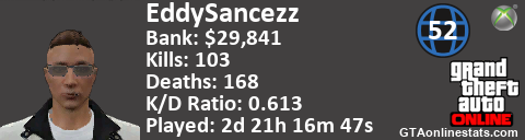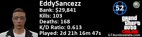 <a href="http://GTAonlinestats.com/showplayer/EddySancezz"><img src="http://GTAonlinestats.com/signature/EddySancezz/sig.png" alt="EddySancezz" border="0" /></a>