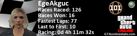 [URL=http://GTAonlinestats.com/showplayer/EgeAkguc][IMG]http://GTAonlinestats.com/racesignature/EgeAkguc/sig.png[/IMG][/URL]