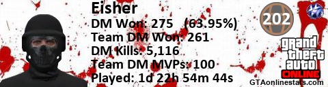[URL=http://GTAonlinestats.com/showplayer/Eisher][IMG]http://GTAonlinestats.com/dmsignature/Eisher/sig.png[/IMG][/URL]