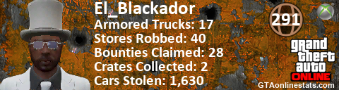 [URL=http://GTAonlinestats.com/showplayer/El_Blackador][IMG]http://GTAonlinestats.com/crimesignature/El_Blackador/sig.png[/IMG][/URL]