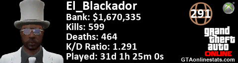 <a href="http://GTAonlinestats.com/showplayer/El_Blackador"><img src="http://GTAonlinestats.com/randomsignature/El_Blackador/sig.png" alt="El_Blackador" border="0" /></a>