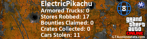 [URL=http://GTAonlinestats.com/showplayer/ElectricPikachu/5][IMG]http://GTAonlinestats.com/crimesignature/ElectricPikachu/5/sig.png[/IMG][/URL]
