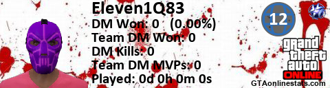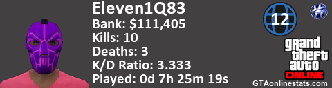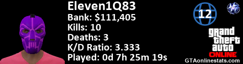 [URL=http://GTAonlinestats.com/showplayer/Eleven1Q83][IMG]http://GTAonlinestats.com/signature/Eleven1Q83/sig.png[/IMG][/URL]