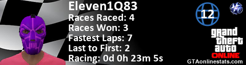<a href="http://GTAonlinestats.com/showplayer/Eleven1Q83"><img src="http://GTAonlinestats.com/racesignature/Eleven1Q83/sig.png" alt="Eleven1Q83" border="0" /></a>