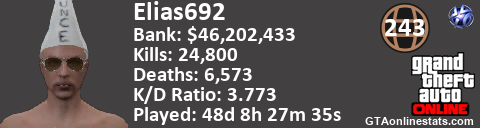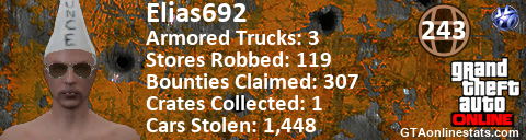 <a href="http://GTAonlinestats.com/showplayer/Elias692"><img src="http://GTAonlinestats.com/randomsignature/Elias692/sig.png" alt="Elias692" border="0" /></a>
