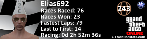 <a href="http://GTAonlinestats.com/showplayer/Elias692"><img src="http://GTAonlinestats.com/racesignature/Elias692/sig.png" alt="Elias692" border="0" /></a>