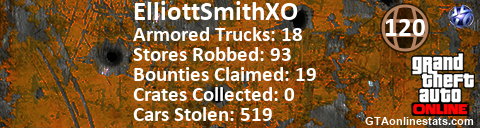 [URL=http://GTAonlinestats.com/showplayer/ElliottSmithXO/2][IMG]http://GTAonlinestats.com/signature/ElliottSmithXO/2/sig.png[/IMG][/URL]