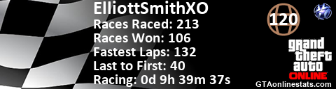[URL=http://GTAonlinestats.com/showplayer/ElliottSmithXO/2][IMG]http://GTAonlinestats.com/racesignature/ElliottSmithXO/2/sig.png[/IMG][/URL]