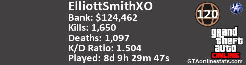 <a href="http://GTAonlinestats.com/showplayer/ElliottSmithXO/2"><img src="http://GTAonlinestats.com/signature/ElliottSmithXO/2/sig.png" alt="ElliottSmithXO" border="0" /></a>