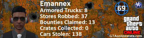 [URL=http://GTAonlinestats.com/showplayer/Emannex][IMG]http://GTAonlinestats.com/crimesignature/Emannex/sig.png[/IMG][/URL]