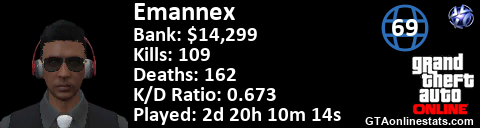 <a href="http://GTAonlinestats.com/showplayer/Emannex"><img src="http://GTAonlinestats.com/dmsignature/Emannex/sig.png" alt="Emannex" border="0" /></a>