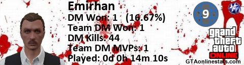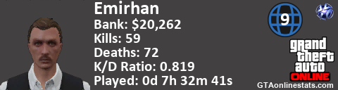 [URL=http://GTAonlinestats.com/showplayer/Emirhan][IMG]http://GTAonlinestats.com/randomsignature/Emirhan/sig.png[/IMG][/URL]