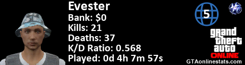 <a href="http://GTAonlinestats.com/showplayer/Evester"><img src="http://GTAonlinestats.com/signature/Evester/sig.png" alt="Evester" border="0" /></a>