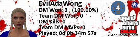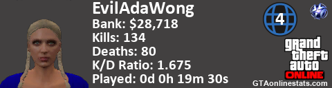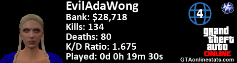 [URL=http://GTAonlinestats.com/showplayer/EvilAdaWong/2][IMG]http://GTAonlinestats.com/dmsignature/EvilAdaWong/2/sig.png[/IMG][/URL]